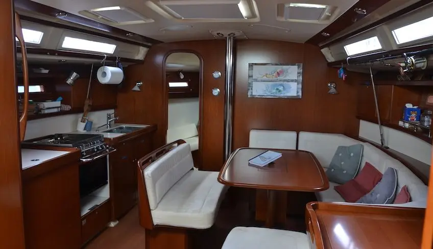 The Elan 410 has a particularly comfortable interior, including 3 double bed cabins, 2 bathrooms with shower room, a large and well-designed kitchen, refrigerator, and stereo with internal and external speakers.