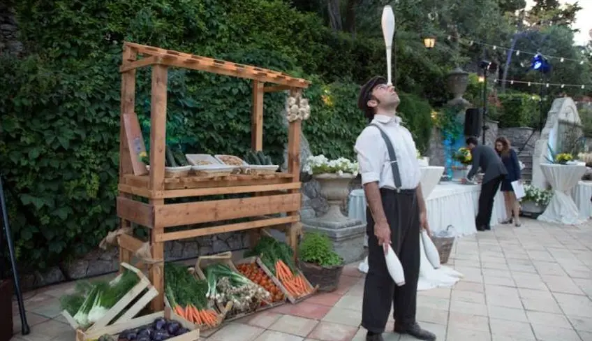 - Transfer of the guests. Music licensing rights (SIAE). Accommodation for the staff. Rental of the location. Extra artists or characters in costume. A newsboy who will deliver to the guests an old-style newspaper within which there'll be a personalized menu, an editorial piece about the customer and more information about Italy's traditions, language and curiosities. Folklore group. A photographer in costumer and an old-style camera, including an area with old-style clothes so you can dress up for the photos, printed there and then, in sepia. A Vespa, Fiat 500 or a traditional Sicilian cart to be featured in the photos of the participants.