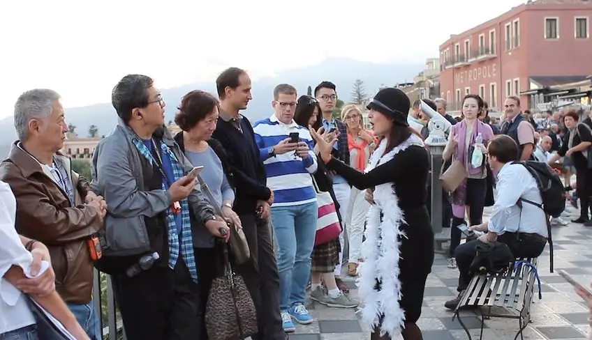 Ваш гид проведет вас по улицам, плкажет памятники и знаменитые здания сицилийского города. Благодаря этому туру вы встретитесь с "Genius Loci", духами, населяющими эти места, познакомитесь с богатой исторей, которая оживет благодаря повествованию профессиональных актеров в исторических костюмах и древних реквизитах. Вы будете заинтригованы историей знаменитого языка жестов сицилийцев, а научитесь использовать этот уникальный язык. Вы попробуете сыграть на марандзано, одном из старейших музыкальных инструментов в мире, и услышите его характерный звук. Вы узнаете об известных людях, внесших вклад в культурное наследие Сицилии.